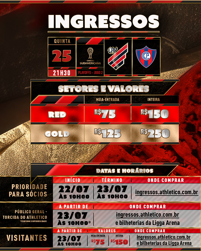 Atenção: de acordo com o regulamento da CONMEBOL Sudamericana, as bilheterias físicas da Ligga Arena não abrirão na quinta-feira (25) para venda de ingressos. Funcionarão somente na terça-feira (23) e quarta-feira (24), de acordo com a disponibilidade. No dia do jogo, a comercialização de entradas será feita exclusivamente pelo ingressos.athletico.com.br, conforme a disponibilidade.