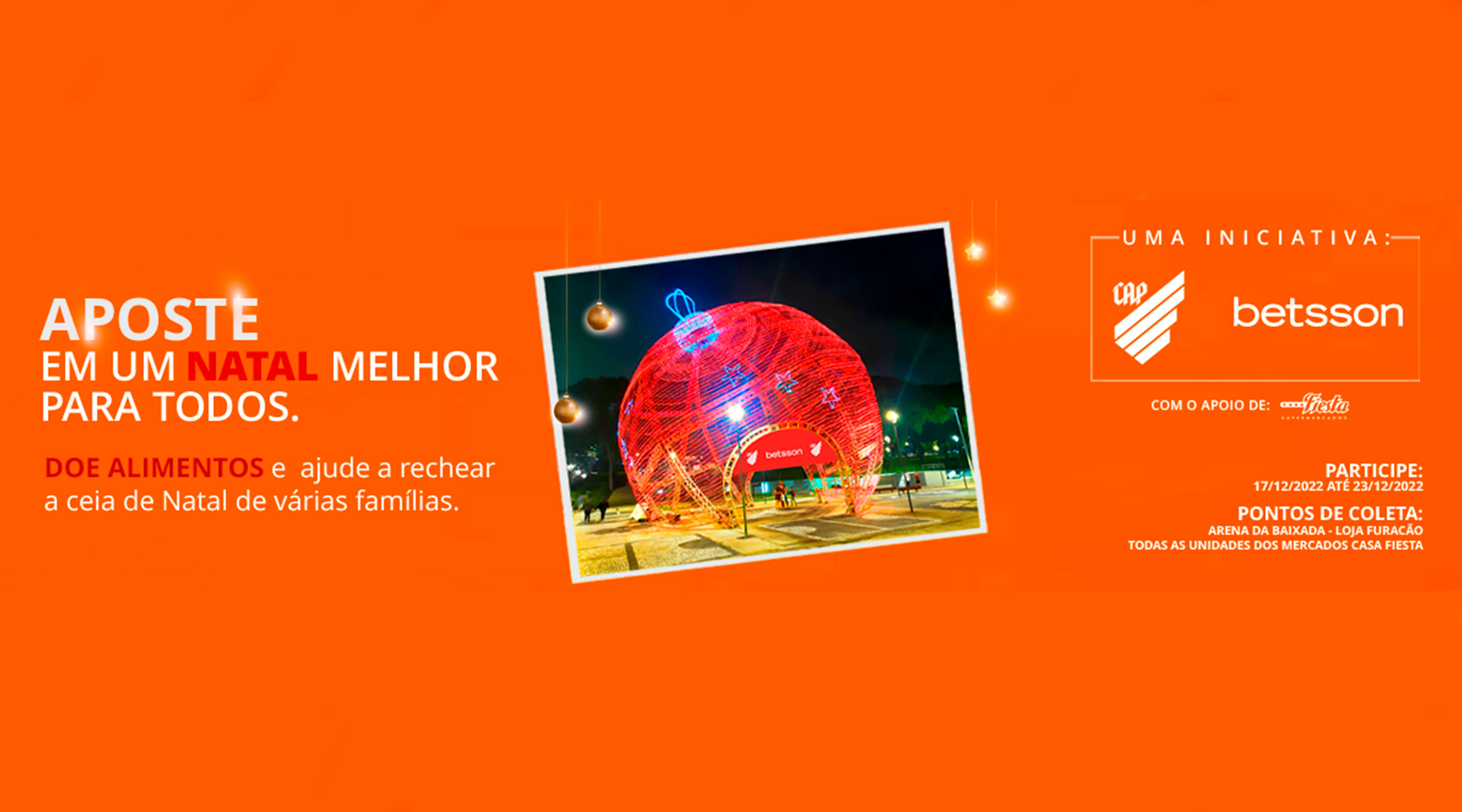 A fim de celebrar a parceria de sucesso e rechear a ceia de diversas famílias curitibanas, o Athletico Paranaense e a Betsson vão promover entre os dias 17 e 23 de dezembro, a campanha “Aposte em um Natal melhor para todos”. A ação convida a população a doar alimentos não perecíveis e cestas básicas, que serão doadas para famílias carentes da Vila Torres, comunidade localizada no bairro Rebouças, em Curitiba.