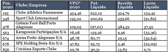 O Rubro-Negro é o clube de futebol mais bem colocado no ranking “500 Maiores do Sul”. Medição que é feita pelo Grupo Amanhã e auditada pelo PricewaterhouseCoopers [PwC] do Brasil. Há mais de três décadas, o levantamento avalia ano a ano os indicadores de desempenho das principais empresas dos estados do Paraná, Santa Catarina e Rio Grande do Sul.