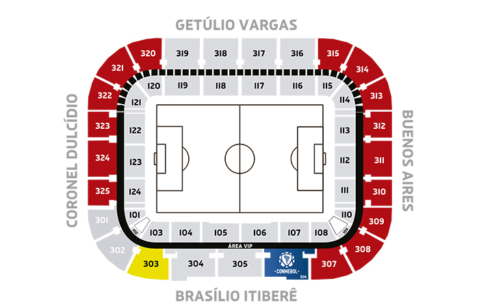 Os Sócios do setor 306 assistem aos jogos em casa pela CONMEBOL Libertadores 2023 no setor 303, também localizado na Brasílio Itiberê Superior.