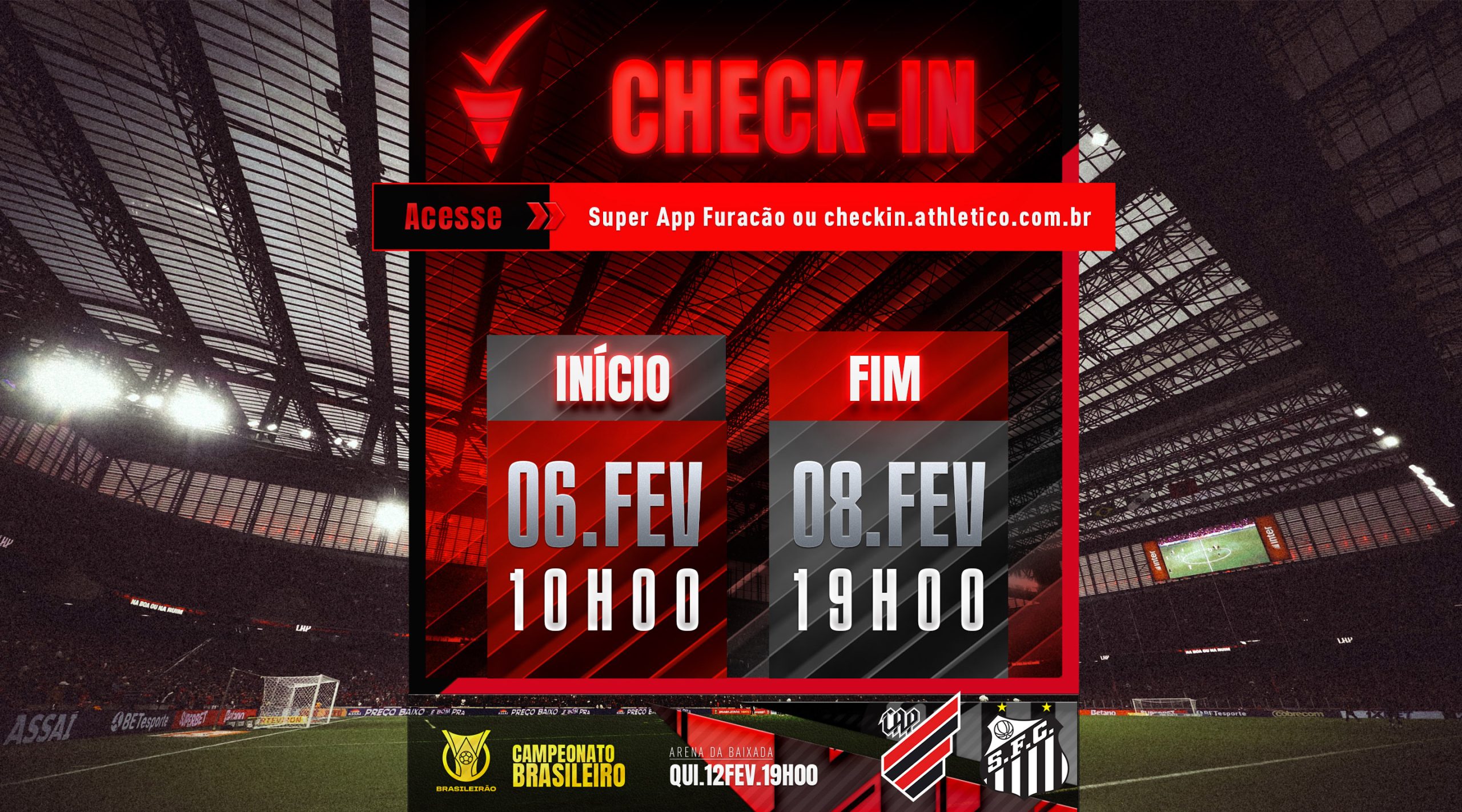 Atenção, Sócio Furacão! O check-in para o primeiro jogo em casa pelo Brasileirão 2026 começa nesta sexta-feira (6), às 10h.