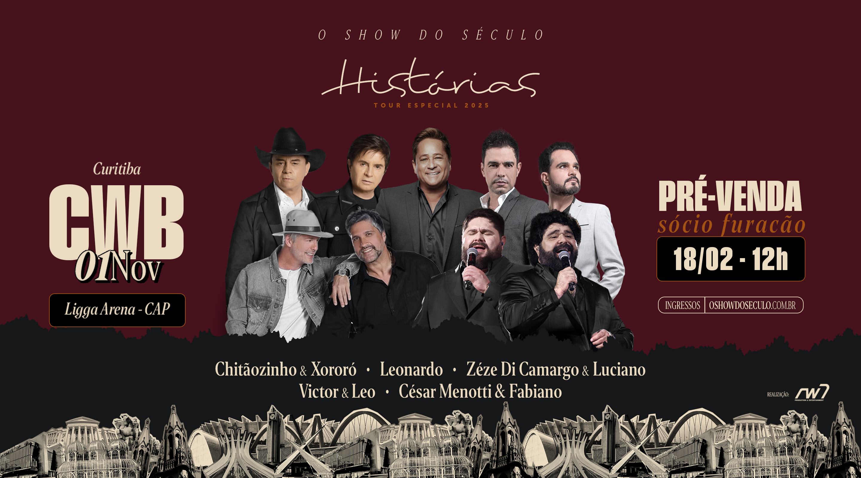 Grandes nomes da música sertaneja irão se reunir em um evento histórico. Pela primeira vez em Curitiba, o festival “Histórias: Show do Século” trará artistas renomados para um evento especial na Ligga Arena. Na capital paranaense, Chitãozinho & Xororó, Leonardo, Zezé Di Camargo & Luciano, Victor & Leo e César Menotti & Fabiano irão se apresentar em um evento que promete, mais uma vez, emocionar diferentes públicos e gerações.