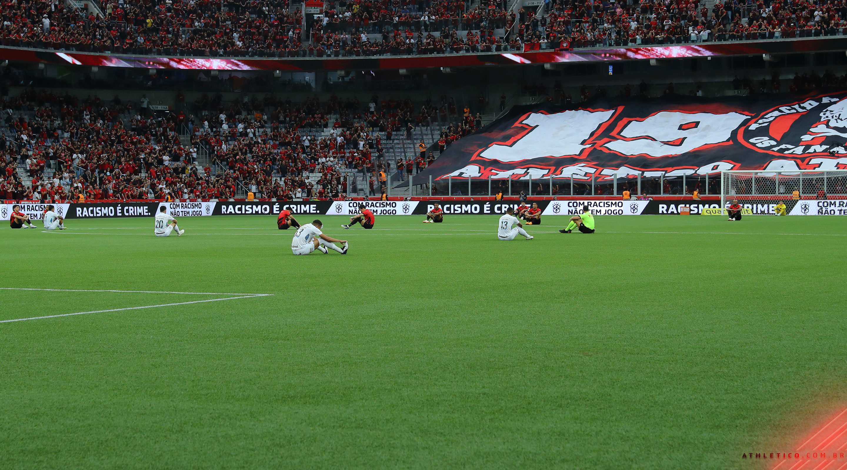 Após o apito inicial da partida, os atletas de Athletico e Grêmio permaneceram sentados no gramado por 30 segundos. Foi um ato de protesto contra os casos de racismo vistos recentemente no futebol.