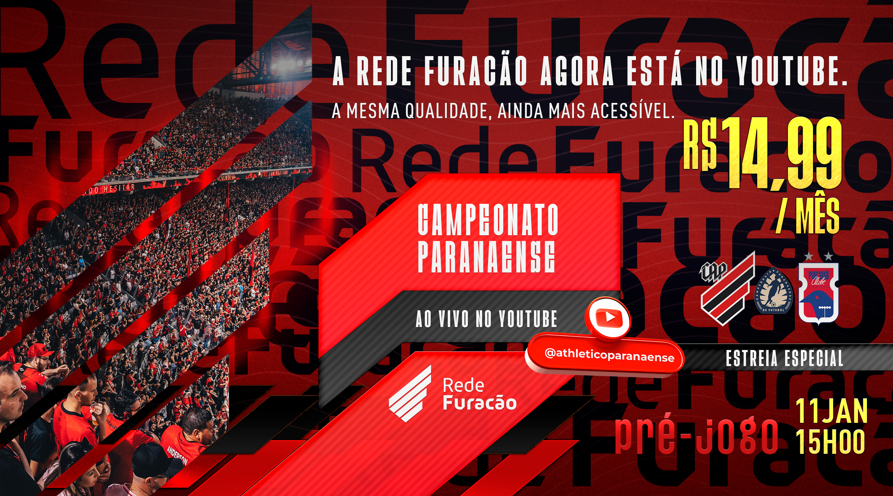 Além dos vídeos de conteúdos exclusivos, as transmissões dos jogos do Furacão também serão realizadas no Youtube. A Rede Furacão transmitirá todos os jogos do Rubro-Negro no Estadual (dentro e fora do Caldeirão). Para assistir às partidas, basta acessar https://www.youtube.com/AthleticoParanaense e se tornar membro do canal do Athletico por R$ 14,99 ao mês.