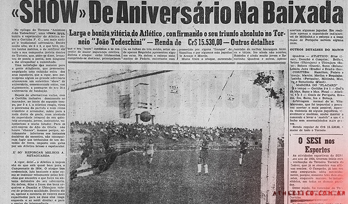 Poucas vezes o aniversário do Athletico foi tão comemorado quanto em 1954. A festa foi no dia 27 de março, um dia após o clube completar 30 anos de fundação. E teve goleada no clássico, troféu para a galeria rubro-negra e muita alegria nas arquibancadas do Caldeirão.