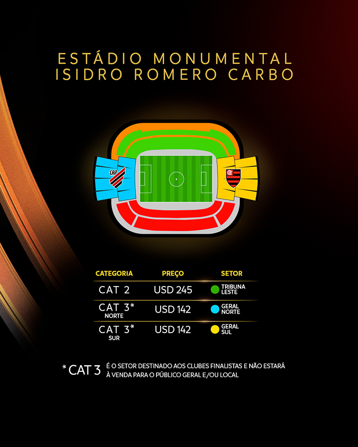A torcida do Athletico Paranaense será acomodada no setor CAT3 – Geral NORTE do Estádio Monumental Isidro Romero Carbo, em Guayaquil.