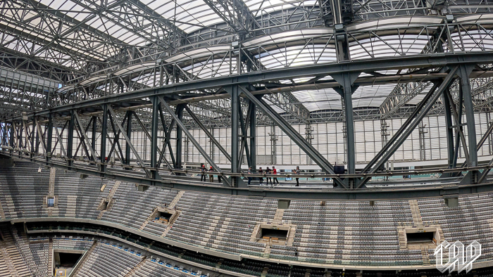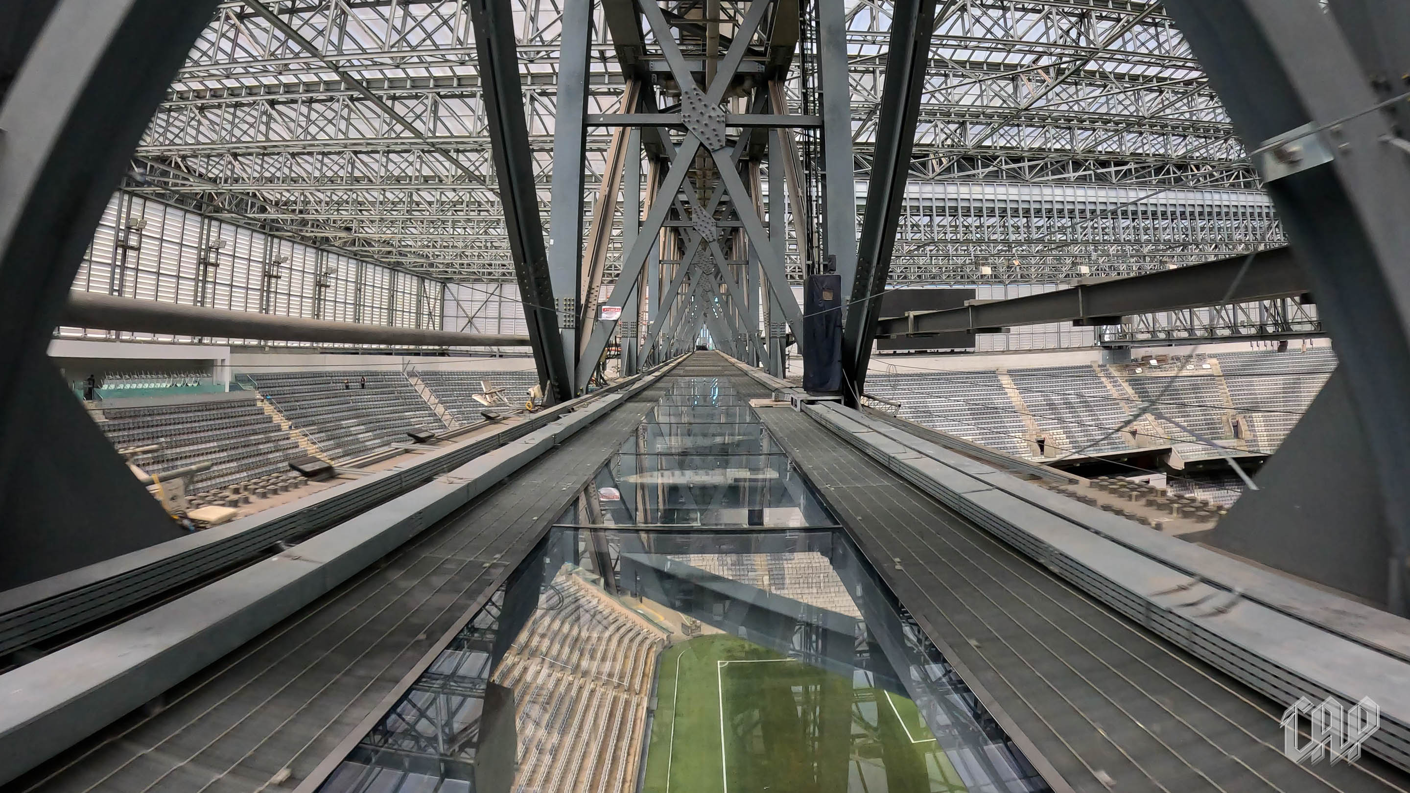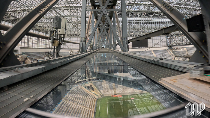 Caminhar por uma passarela de vidro localizada em uma das vigas metálicas que sustentam a cobertura do estádio!