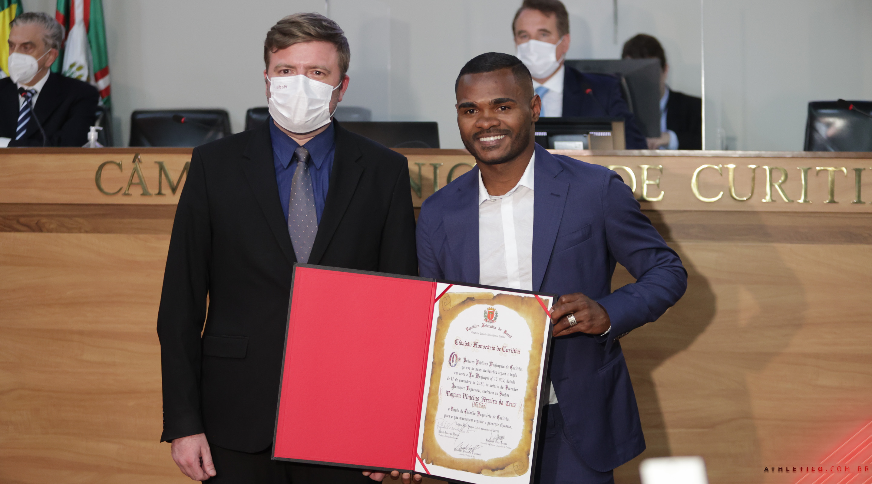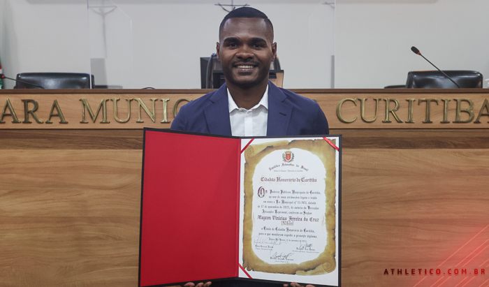 Nikão recebeu na última segunda-feira (22) mais um título que marca a sua bela trajetória no Athletico Paranaense. O camisa 11 se tornou Cidadão Honorário da cidade de Curitiba, em cerimônia realizada no plenário da Câmara Municipal. O evento teve a participação de diversas autoridades, amigos e familiares, incluindo Mario Celso Petraglia, presidente do Conselho Administrativo e atual CEO do Rubro-Negro.