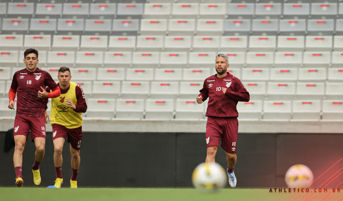 O trabalho prático no gramado da Arena começou por volta das 16h. Em torno de uma hora e meia, o time athleticano trabalhou as abordagens estratégicas para o clássico. Também ensaiou jogadas de bola parada e finalizações em gol. A parte final do treino contou ainda com um trabalho técnico em campo reduzido.
