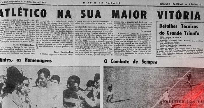 Uma partida lendária da história rubro-negra está completando 55 anos nesta sexta-feira (8). No dia 8 de setembro de 1968, o Athletico Paranaense derrotou o Santos por 3 a 2 e fez história dentro e fora do gramado, com mais de 24 mil pessoas superlotando a Vila Capanema.