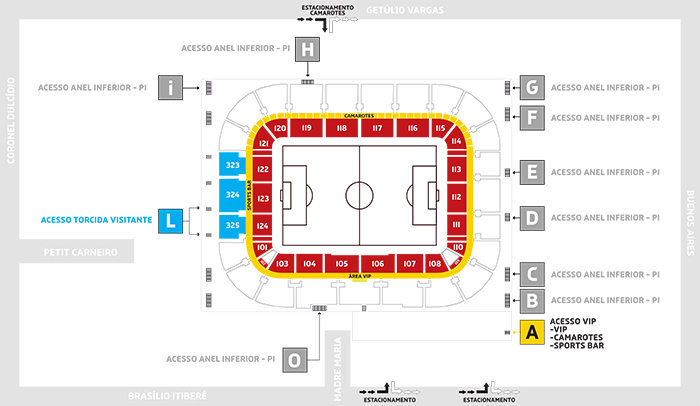 Os portões do Estádio Joaquim Américo serão abertos às 18h nesta segunda-feira (28). Veja o mapa abaixo: