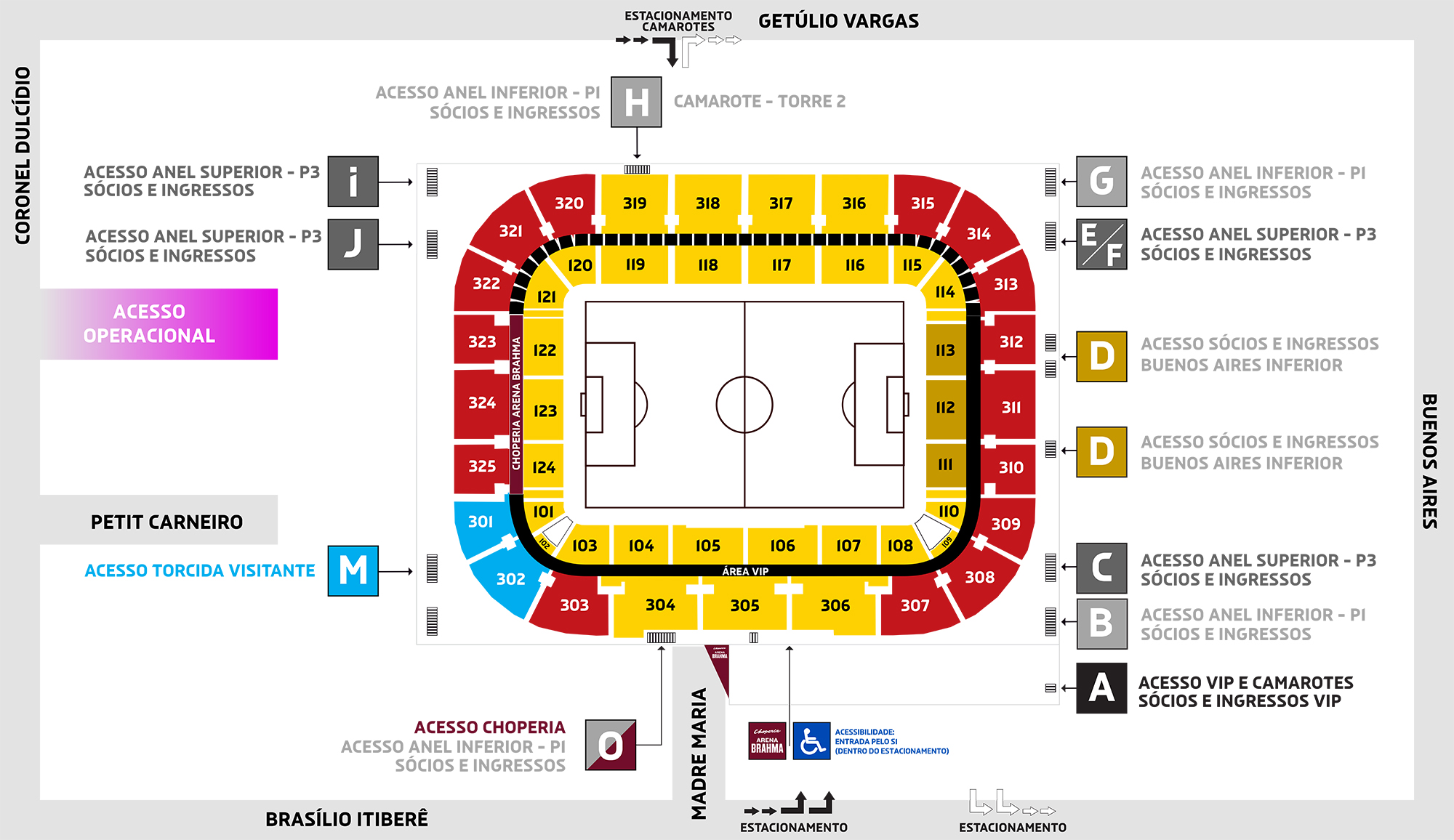 A entrada da torcida visitante à Ligga Arena é feita através do Portão M, localizado na Rua Petit Carneiro.