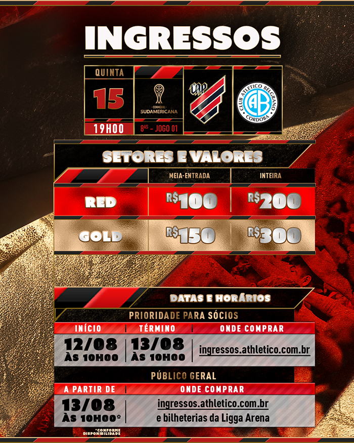 Atenção: de acordo com o regulamento da CONMEBOL Sudamericana, as bilheterias físicas da Ligga Arena não abrirão na quinta-feira (15) para venda de ingressos. Funcionarão somente na terça-feira (13) e quarta-feira (14), de acordo com a disponibilidade. No dia do jogo, a comercialização de entradas será feita exclusivamente pelo ingressos.athletico.com.br, conforme a disponibilidade.