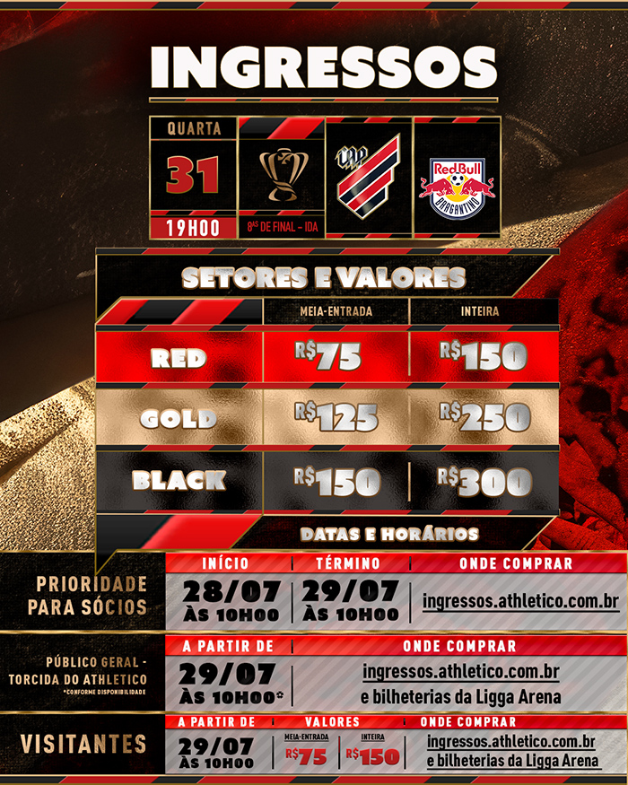 Os ingressos para a torcida do Red Bull Bragantino começam a ser vendidos às 10h de segunda-feira (29), no ingressos.athletico.com.br e nas bilheterias da Ligga Arena. As entradas custam R$ 75 (meia) e R$ 150 (inteira).