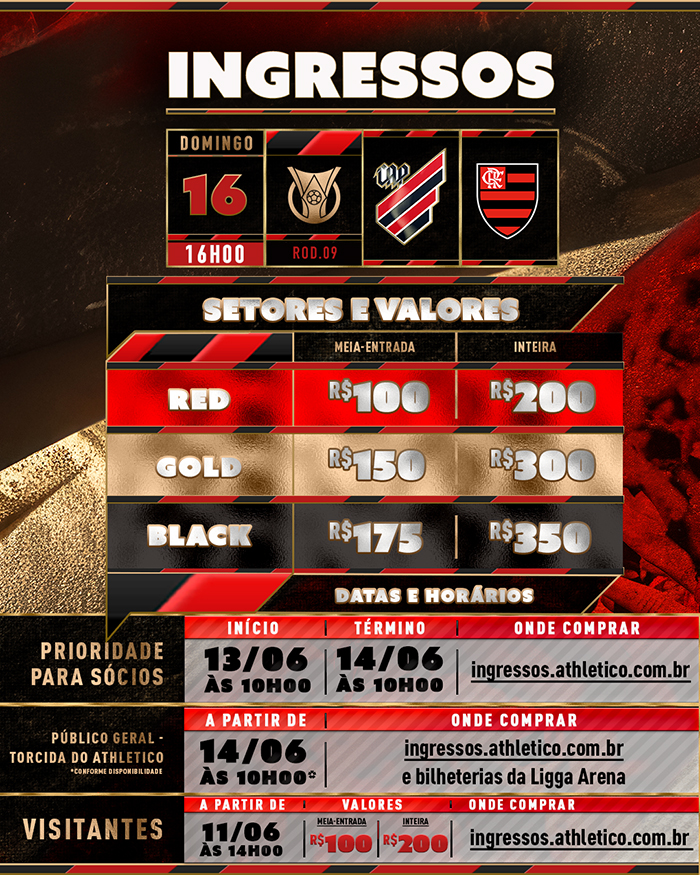 – Site ingressos.athletico.com.br: a partir das 10h de sexta-feira (14)