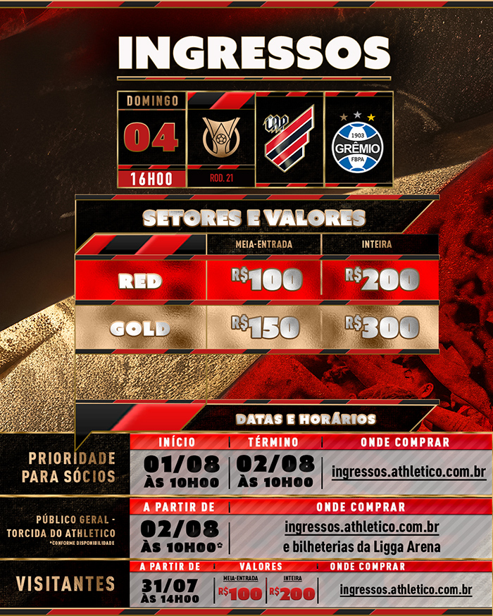 Os ingressos para a torcida do Grêmio começam a ser vendidos às 14h de quarta-feira (31), exclusivamente no ingressos.athletico.com.br. As entradas custam R$ 100 (meia) e R$ 200 (inteira).