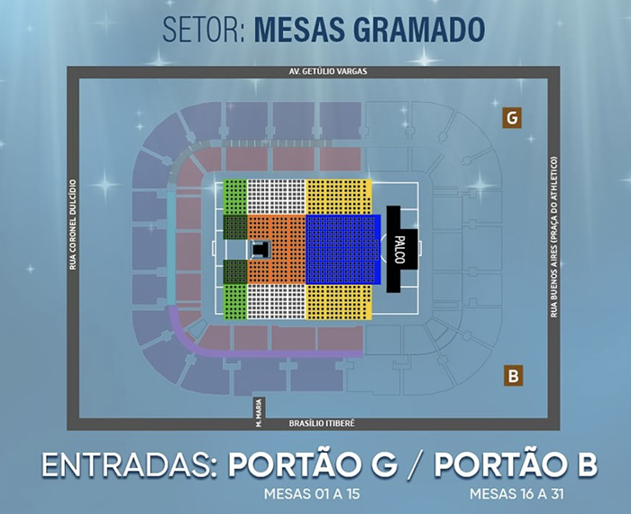 Gramado: Portão G (mesas 01 a 15) e Portão B (mesas 16 a 31)