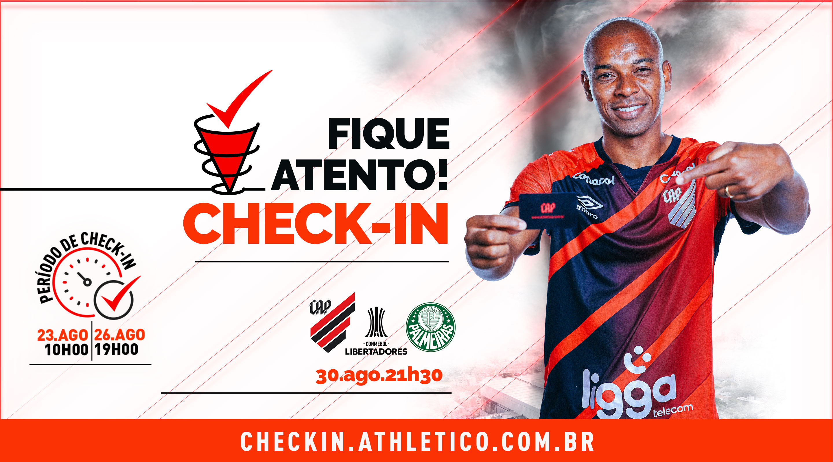O check-in dos Sócios Furacão começa às 10h desta terça-feira (23), exclusivamente através do site checkin.athletico.com.br e será encerrado às 19h de sexta-feira (26).
