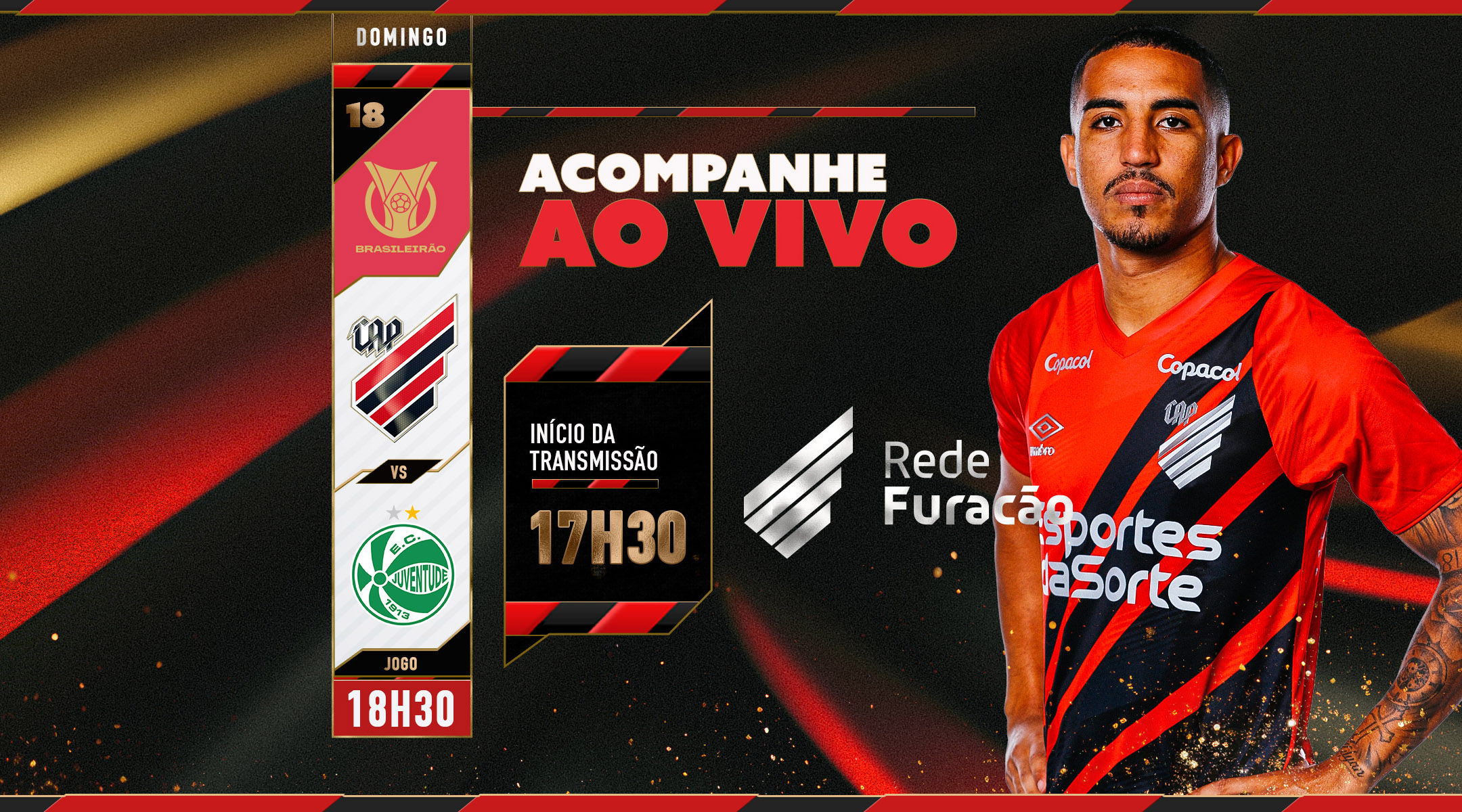 Este domingo (18) é dia de mais um desafio pelo Campeonato Brasileiro! O Athletico estará em campo na Ligga Arena para enfrentar o Juventude, às 18h30. A partida é válida pela 23ª rodada e o Furacão busca três pontos para se aproximar do G6.
