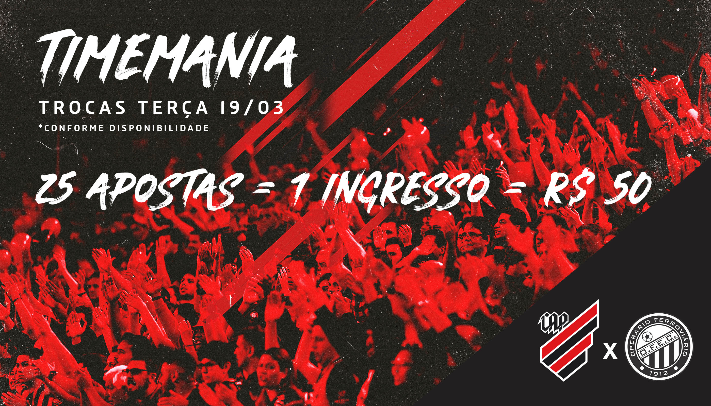 O Athletico Paranaense promoverá as trocas de Timemanias exclusivamente nesta terça-feira (19), das 10h às 18h, conforme disponibilidade. Com 25 apostas, o equivalente a R$ 50, você garante um ingresso inteiro para o Setor Brasílio Itiberê Superior ou Setor Getúlio Vargas Superior. As trocas são limitadas!