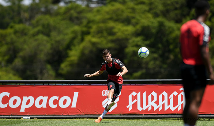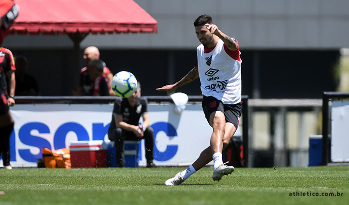 No último treinamento, exercícios táticos. O posicionamento do time e as bolas paradas foram o enfoque em uma manhã ensolarada de sábado (7), com temperatura alta na capital paranaense.